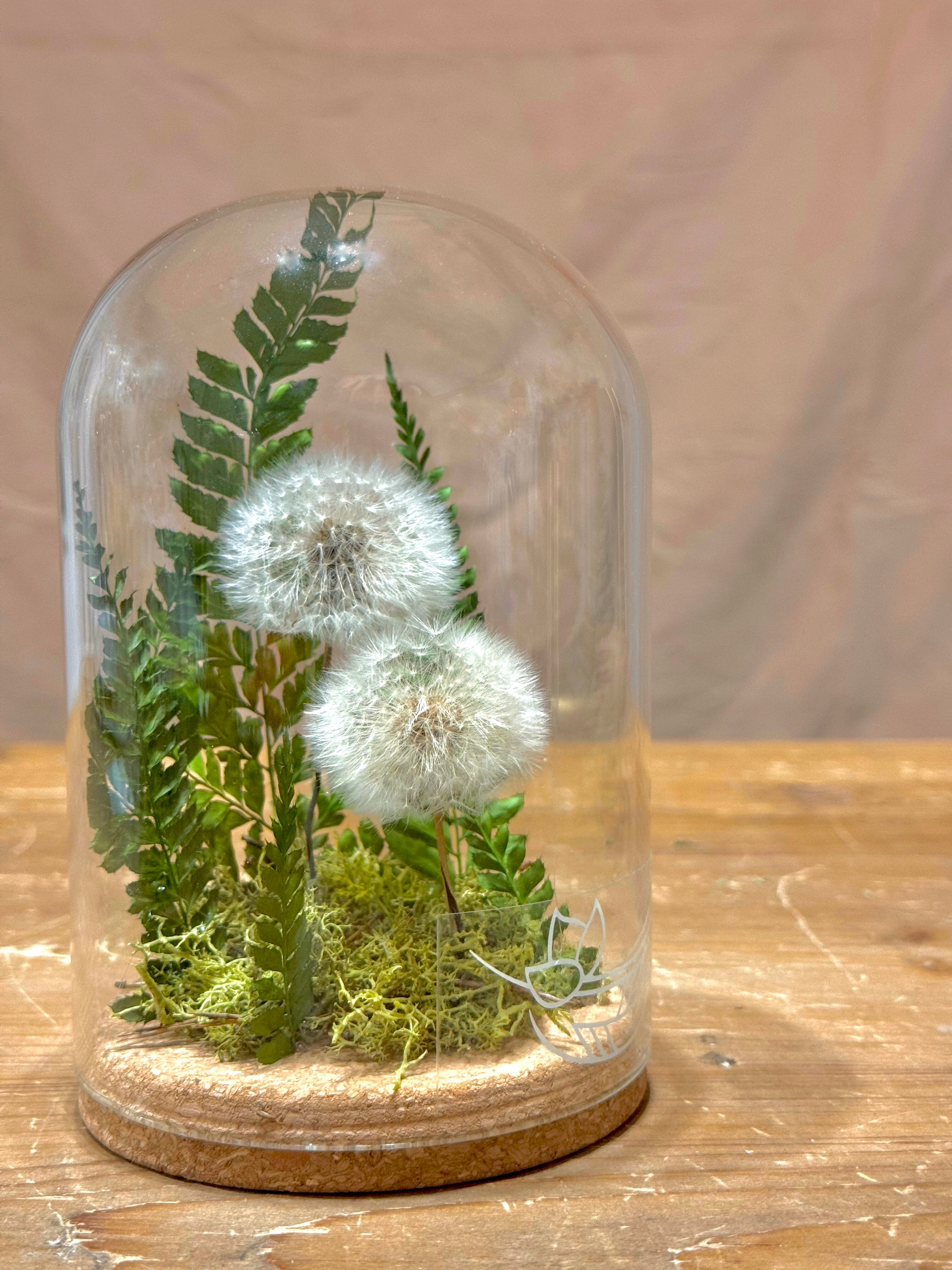 ふわりと咲いたタンポポの綿毛をガラスドームに。